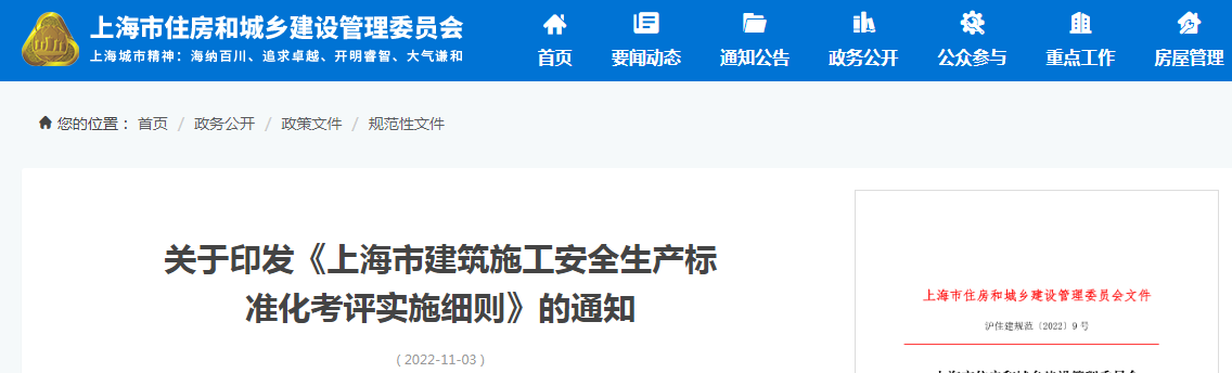 為進一步加強建筑施工安全生產管理,規范建筑施工安全生產標準化考評工作,依據《建筑施工安全生產標準化考評暫行辦法》(建質〔2014〕111號)等有關規定,我委制定了《上海市建筑施工安全生產標準化考評實施細則》,現印發給你們,請遵照執行。