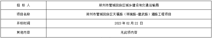 經招標人確定,現將該項目鄭州市管城回族區天福路(祥瑞路-建武路)道路工程項目(標段編號:22-GC-1247-01)的中標結果公告如下: